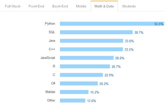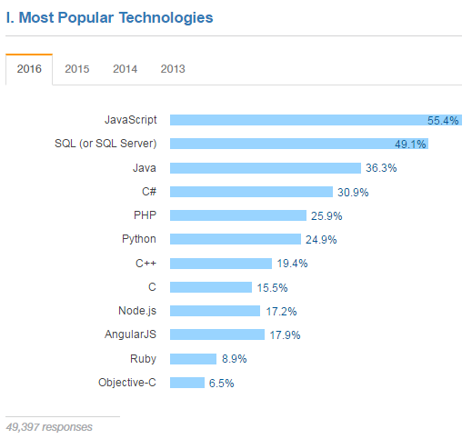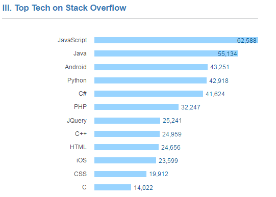 事实上,IT技术问答网站stack overflow,根据2016年5万名程序员提供的数据,也制作了一份报告,从中可以看出,Python的势头已经很明显。