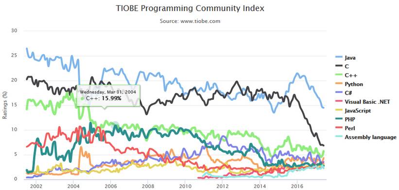 Top 10 编程语言 TIOBE 指数走势(2002-2016)▼