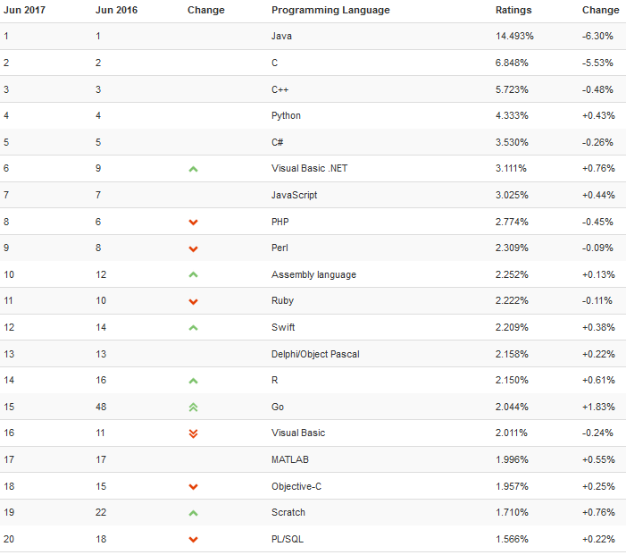 TIOBE编程语言排行榜 TOP20 榜单(2017.6)▼